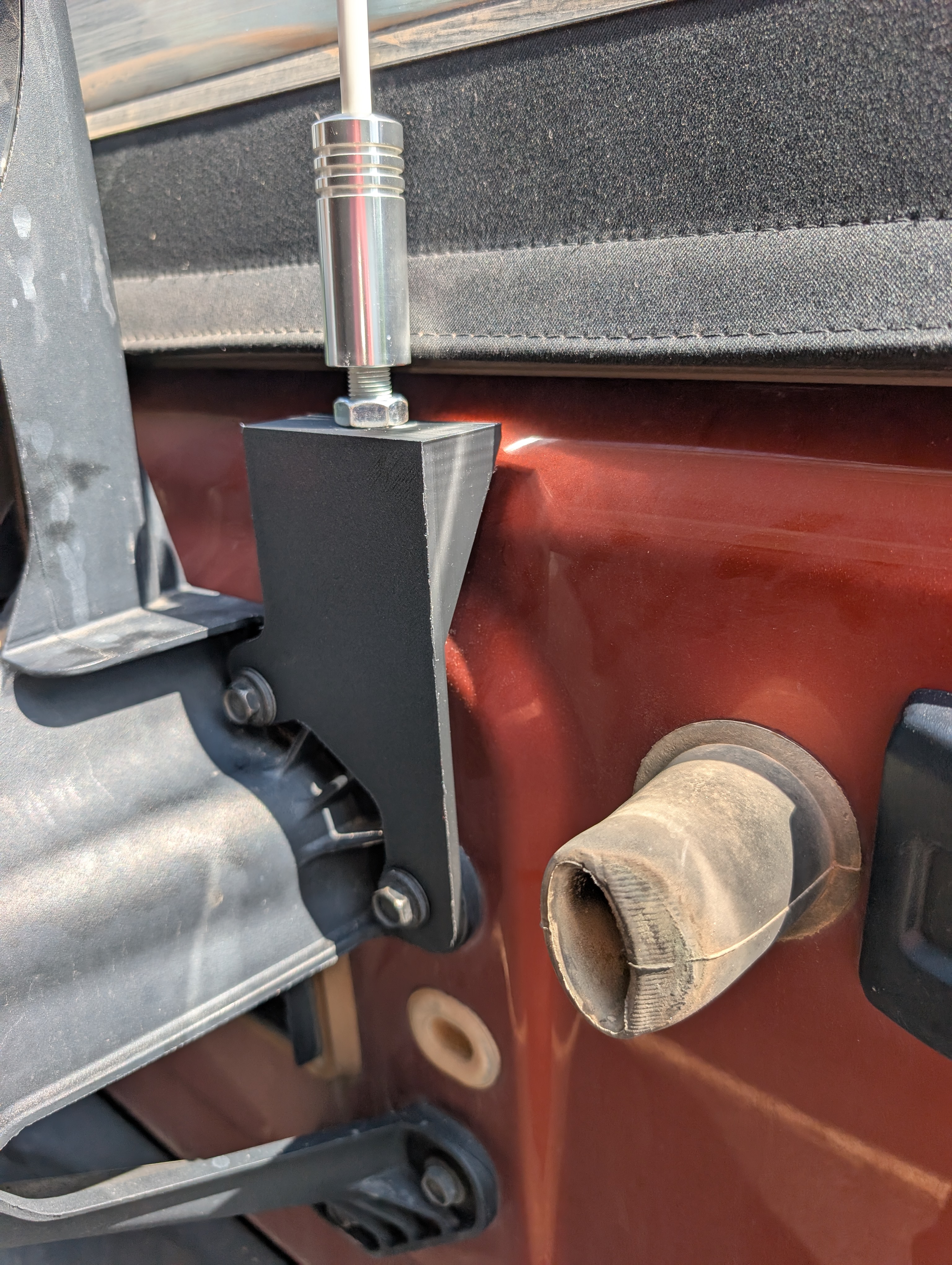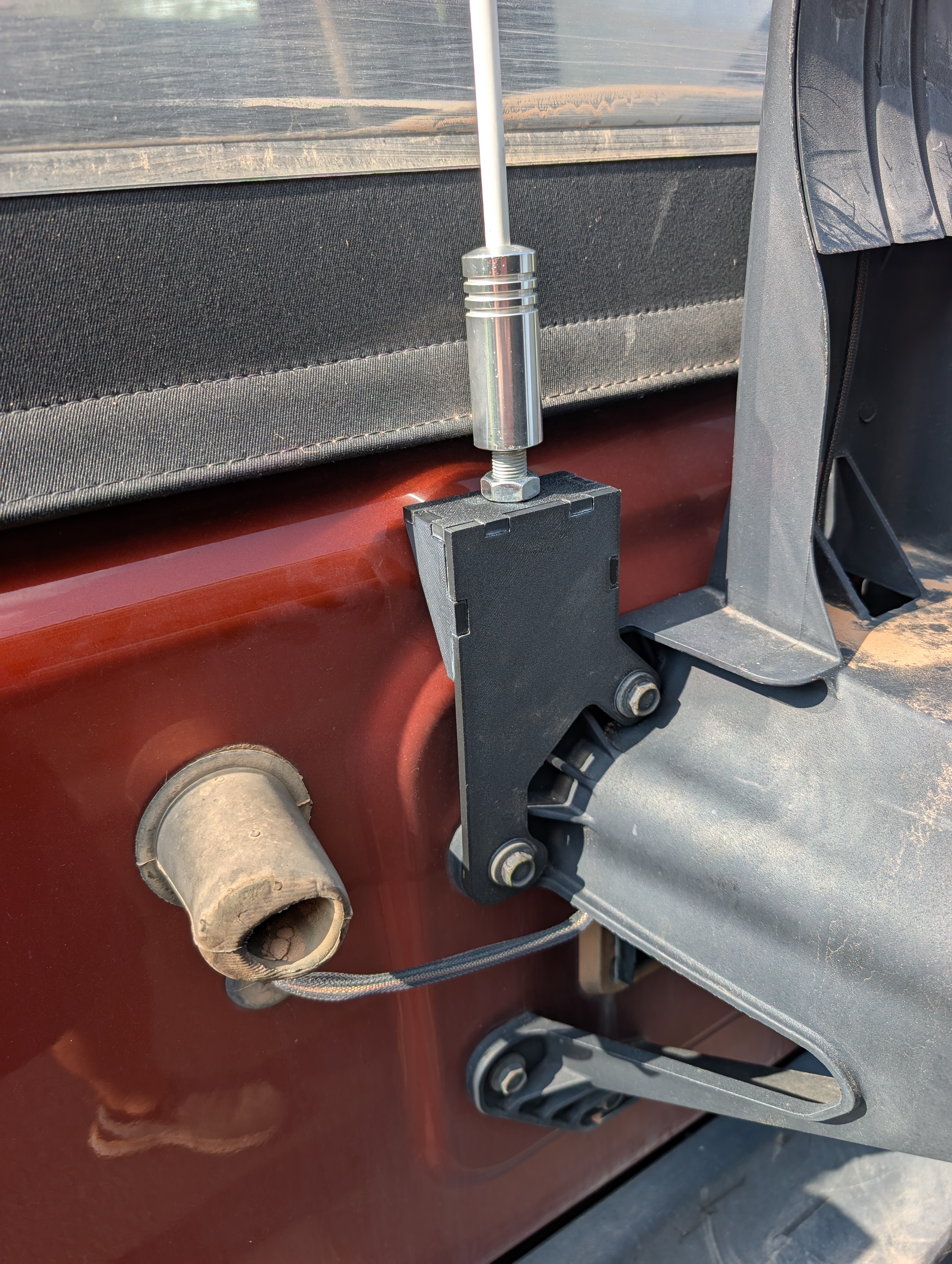 I designed and had fabricated a bracket that mounts to my Jeep JK spare tire carrier. The bracket holds either a safety flag for off-roading (my application), or a CB antenna. The bracket that is available for purchase online doesn't provide clearance for a stock spare tire. I designed the bracket in SolidWorks as a weldment, 3D printed it to check fit and function, and then uploaded the .STEP files to OSH Cut for laser cutting from 3/16" thick A36 / A1011, HR P&O steel. Note that my bracket design provides a top flange that points toward the front of the vehicle to provide clearance to the spare tire. This is opposite of what the commonly available bracket designs do. The bracket mounts on either the driver's side, or the passenger side of the spare tire carrier.